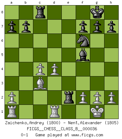 Last move : 0-1 2008 January 22 19:19:40 [Event "FICGS__CHESS__CLASS_B__000036"] [Site "FICGS"] [Date "2007.12.14"] [Round "1"] [White "Zaichenko,Andrey"] [Black "Nent,Alexander"] [Result "0-1"] [WhiteElo "1800"] [BlackElo "1805"] 1.b4 e5 2.Bb2 Bxb4 3.Bxe5 Nf6 4.Nf3 O-O 5.e3 Re8 6.Be2 d5 7.O-O c5 8.c4 Nc6 9.Bb2 d4 10.exd4 cxd4 11.d3 Qe7 12.Nxd4 Nxd4 13.Bxd4 Qxe2 14.Nc3 Bxc3 15.Bxc3 Bf5 16.Qxe2 Rxe2 17.Rfd1 Rd8 18.d4 Rc8 0-1 Polish (Sokolsky) opening Kingside Castling by player Black (move 4) Kingside Castling by player White (move 7) Player Black won this chess game. Follow this game move after move (download)By the beauty of his games, the clarity of his play, and the brilliance of his ideas, Fischer made himself an artist of the same stature as Brahms, Rembrandt, and Shakespeare. (David Levy) Wer mein Gambit spielt, muß bereit sein, alle Brücken hinter sich abzubrechen. Es verändert den ganzen Menschen. Es wirkt wie ein Zauberstab und fördert verkümmerte, gute Charakter- eigenschaften wieder zu Tage. (Emil Joseph Diemer) La batalla por la última verdad nunca sera ganada. Y es por eso que el Ajedrez es tan fascinante. (Hans Kmoch) En blitz, le Cavalier l'emporte sur le Fou. (Vlastimil Hort) Pushing plastic is for the many, pushing virtual pieces is for the fewer, pushing wood is for the very few. (Normajean Yates)