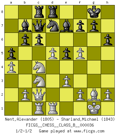 Last move : 1/2-1/2 2008 March 3 7:30:17 [Event "FICGS__CHESS__CLASS_B__000036"] [Site "FICGS"] [Date "2007.12.14"] [Round "1"] [White "Nent,Alexander"] [Black "Sharland,Michael"] [Result "1/2-1/2"] [WhiteElo "1805"] [BlackElo "1843"] 1.d4 Nf6 2.c4 e6 3.g3 d5 4.Nf3 Bb4+ 5.Bd2 Be7 6.Bg2 O-O 7.O-O c6 8.Qc2 Nbd7 9.Bf4 b6 10.Rd1 Bb7 11.Nc3 dxc4 12.Nd2 Nd5 13.Nxc4 Nxf4 14.gxf4 Qc7 15.e3 Rac8 16.Rac1 Rfd8 17.a3 a5 18.a4 h6 19.f5 e5 20.d5 1/2-1/2 Catalan Opening Kingside Castling by player Black (move 6) Kingside Castling by player White (move 7) This chess game ended in a draw. Follow this game move after move (download)I have added these principles to the law: get the Knights into action before both Bishops are developed. (Emanuel Lasker) Im Schach gewinnt jeder. Hat man Freunde am Spiel - und das ist die Hauptsache - ist auch der Verlust einer Partie kein Unglück. (David Bronstein) El jugador de combinación piensa hacia adelante; comienza de la posición dada y trabaja las movidas contundentes en su mente. (Emanuel Lasker) Le succès, c'est être capable d'aller d'échec en échec sans perdre son enthousiasme. (Winston Churchill) Good decisions come from experience, and experience comes from bad decisions. (Anonymous)