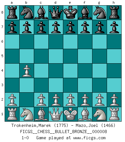 Last move : 1-0 2008 March 19 10:41:24 [Event "FICGS__CHESS__BULLET_BRONZE__000008"] [Site "FICGS"] [Date "2008.03.19"] [Round "1"] [White "Trokenheim,Marek"] [Black "Mazo,Joel"] [Result "1-0"] [WhiteElo "1775"] [BlackElo "1466"] 1.b4 1-0 This chess game has been lost on time (started : 2008.03.19 9:38:37) Polish (Sokolsky) opening Player White won this chess game. Follow this game move after move (download)Chess is life. (Bobby Fischer) Ein bischen Romantik kann weder im Schach noch in der Liebe schaden. Also versuche ich mich ab und zu daran zu erinnern. (Nigel Short) Yo nunca en mi vida he jugado la Defensa Francesa, que viene siendo la más aburrida de todas las Aperturas. (Wilhelm Steinitz) Fischer est le meilleur joueur du monde et Karpov n'est qu'un joueur de bistrot. (Garry Kasparov, agé de 16 ans) The Internet is the world's largest library. It's just that all the books are on the floor. (John Allen Paulos)