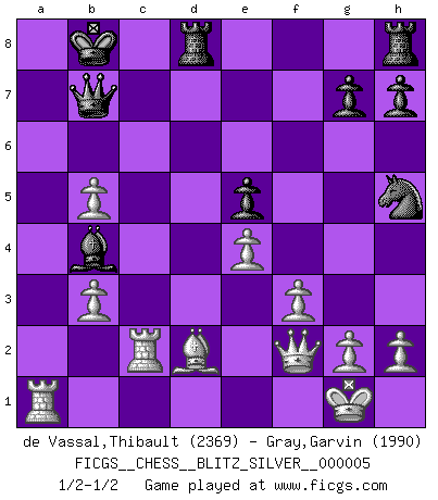 Last move : 1/2-1/2 2007 December 15 15:27:32 [Event "FICGS__CHESS__BLITZ_SILVER__000005"] [Site "FICGS"] [Date "2007.12.15"] [Round "1"] [White "de Vassal,Thibault"] [Black "Gray,Garvin"] [Result "1/2-1/2"] [WhiteElo "2369"] [BlackElo "1990"] 1.d4 Nf6 2.c4 e6 3.Nf3 d5 4.Nc3 c6 5.e3 Nbd7 6.Bd3 dxc4 7.Bxc4 b5 8.Bd3 Bb7 9.O-O a6 10.e4 c5 11.d5 c4 12.Bc2 Qc7 13.dxe6 fxe6 14.Nd4 Nc5 15.Be3 O-O-O 16.Qe2 e5 17.Ndxb5 axb5 18.Nxb5 Qf7 19.f3 Ba6 20.a4 Be7 21.Ra3 Kb8 22.Rc3 Nd3 23.b3 Nh5 24.Bxd3 cxd3 25.Qf2 Bxb5 26.axb5 d2 27.Bxd2 Bb4 28.Ra1 Qb7 29.Rc2 1/2-1/2 Queen's pawn game Kingside Castling by player White (move 9) Queenside Castling by player Black (move 15) This chess game ended in a draw. Follow this game move after move (download)Chess is a part of culture and if a culture is declining then Chess too will decline. (Mikhail Botvinnik) Ich würde mich als ganz normalen Jungen bezeichnen [Im Alter von 12]. (Sergej Karjakin) El Ajedrez es una manera fabulosa para que los niños aprendan a autovalorarse y a autoestimarse. (Saudin Robovic) Avec des compensations pour le matériel en plus... (Anonyme) Two beer, or not two beer. (Unknown)