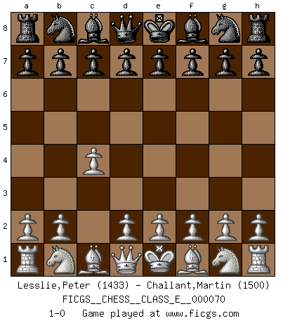 Last move : 1-0 2008 January 25 11:40:21 [Event "FICGS__CHESS__CLASS_E__000070"] [Site "FICGS"] [Date "2007.12.15"] [Round "1"] [White "Lesslie,Peter"] [Black "Challant,Martin"] [Result "1-0"] [WhiteElo "1433"] [BlackElo "1500"] 1.c4 1-0 This chess game has been lost on time (started : 2007.12.15 15:57:14) English Opening Player White won this chess game. Follow this game move after move (download)It's just you and your opponent at the board and you're trying to prove something. (Bobby Fischer) Ich liebe den Moment, wenn ich das Ego meines Gegenüber breche. (Robert James Fischer) El juego de Fischer siempre fue nítido, racional y brillante. Uno de los mejores por siempre. (Dave Regis) Le moment que je préfère le plus dans une rencontre, c'est celui où je sens que la personnalité de l'adversaire se brise. (Robert Fischer) Now you put water in a cup, it becomes the cup; You put water into a bottle it becomes the bottle; You put it in a teapot it becomes the teapot. Water can flow or it can crash. Be water, my friend. (Bruce Lee)