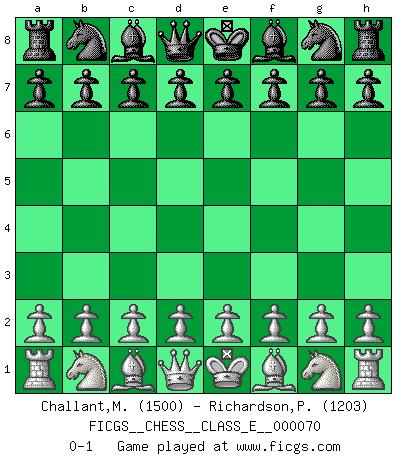 Last move : 0-1 2008 January 24 23:39:41 [Event "FICGS__CHESS__CLASS_E__000070"] [Site "FICGS"] [Date "2007.12.15"] [Round "1"] [White "Challant,Martin"] [Black "Richardson,Patrick"] [Result "0-1"] [WhiteElo "1500"] [BlackElo "1203"] 0-1 This chess game has been lost on time (started : 2007.12.15 15:57:14) Player Black won this chess game. Follow this game move after move (download)Avoid the crowd. Do your own thinking independently. Be the Chess player, not the Chess piece. (Ralph Charell) Wie ich sie so einen nach dem anderen nieder mähte wurde meine Überlegenheit offensichtlich. (José Raúl Capablanca) El Ajedrez es una hermosa aventura. (Bent Larsen) Les échecs c'est le défi de l'alpiniste, toujours plus haut, prêt à tout pour monter à l'assaut du Roi ennemi. Les échecs, c'est de la musique en mouvement, un ballet majestueux pour les yeux. C'est de la poésie composée par les fantômes du passé qui au même titre que Rimbaud ou Verlaine méritent notre admiration. Les échecs, c'est de la peinture ou le moindre mouvement modifie le tableau pour en faire un Picasso ou un Van Gogh. Les échecs, c'est tout et rien, c'est la vie et la mort. Jjulie33 sur le forum de France-Echecs. Work expands to fill the time available. (C. Northcote Parkinson, in Parkinson's Laws)