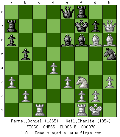 Last move : 1-0 2008 April 19 12:46:17 [Event "FICGS__CHESS__CLASS_E__000070"] [Site "FICGS"] [Date "2007.12.15"] [Round "1"] [White "Parmet,Daniel"] [Black "Neil,Charlie"] [Result "1-0"] [WhiteElo "1365"] [BlackElo "1354"] 1.d4 d5 2.Nf3 Nf6 3.c4 e6 4.Nc3 Be7 5.Bf4 O-O 6.e3 Nbd7 7.Rc1 a6 8.cxd5 Nxd5 9.Nxd5 exd5 10.Bxc7 Qe8 11.Qb3 b5 12.Qxd5 Ra7 13.Bd3 Nf6 14.Qe5 h6 15.O-O Be6 16.a3 Ng4 17.Qg3 f5 18.h3 f4 19.Bxf4 Nf6 20.Bxh6 Nh5 21.Qg6 Bf6 22.Qh7+ Kf7 23.Bg6+ 1-0 Queen's pawn game Kingside Castling by player Black (move 5) Kingside Castling by player White (move 15) Player White won this chess game. Follow this game move after move (download)You must take your opponent into a deep dark forest where 2+2=5, and the path leading out is only wide enough for one. (Mikhail Tal) Schach ist das schnellste Spiel der Welt, weil man in jeder Sekunde Tausende von Gedanken ordnen muß. (Albert Einstein) Un jugador que trata de regresar una movida en el Ajedrez es un futuro carterista. (Richard Fenton) Il n'y a pas de prix trop élevé au scalp de l'ennemi. (Koblentz) Art is the triumph over chaos. (John Cheever)