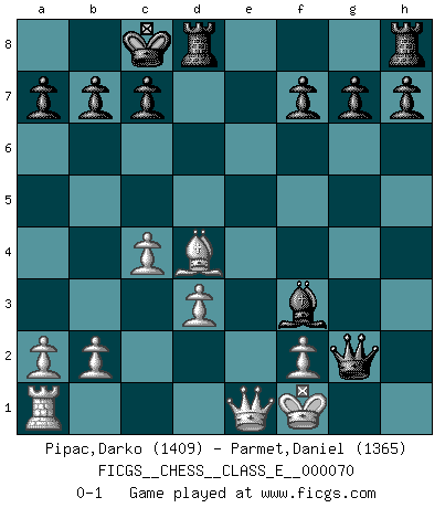 Last move : 0-1 2008 March 7 9:34:21 [Event "FICGS__CHESS__CLASS_E__000070"] [Site "FICGS"] [Date "2007.12.15"] [Round "1"] [White "Pipac,Darko"] [Black "Parmet,Daniel"] [Result "0-1"] [WhiteElo "1409"] [BlackElo "1365"] 1.e4 e5 2.Nf3 Nc6 3.Nc3 Nf6 4.Bb5 Nd4 5.Bc4 Bc5 6.Nxe5 Qe7 7.Nf3 d5 8.Nxd5 Qxe4+ 9.Kf1 Nxd5 10.d3 Qf5 11.Qe1+ Be6 12.Nxd4 Bxd4 13.g4 Qf3 14.Bxd5 Qxd5 15.Rg1 O-O-O 16.c4 Qf3 17.Rg3 Qh1+ 18.Rg1 Qxh2 19.Rg2 Qh1+ 20.Rg1 Qh3+ 21.Rg2 Bxg4 22.Be3 Bf3 23.Bxd4 Qxg2+ 0-1 Four knights : Rubinstein counter-gambit Queenside Castling by player Black (move 15) Player Black won this chess game. Follow this game move after move (download)The older I grow, the more I value pawns. (Paul Keres) Die starken Figuren des Gegners muss man abtauschen. (José Raúl Capablanca) ¿Esta Bobby Fischer algo cuerdo?. (Salo Flohr) Même si l'adversaire joue le coup analysé précédemment, recommencez l'analyse en voyant la nouvelle position. Première règle de Blumenfeld It's not the will to win, but the will to prepare to win that makes the difference. (Bear Bryant)