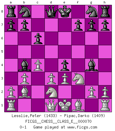 Last move : 0-1 2008 February 23 14:21:15 [Event "FICGS__CHESS__CLASS_E__000070"] [Site "FICGS"] [Date "2007.12.15"] [Round "1"] [White "Lesslie,Peter"] [Black "Pipac,Darko"] [Result "0-1"] [WhiteElo "1433"] [BlackElo "1409"] 1.Nf3 d5 2.c4 c6 3.b3 Bg4 4.e3 d4 5.d3 e5 6.Bb2 Bb4+ 7.Nbd2 dxe3 8.fxe3 e4 0-1 This chess game has been lost on time (started : 2007.12.15 15:57:14) Reti Opening Player Black won this chess game. Follow this game move after move (download)Fischer is the strongest player in the world. In fact, the strongest player who ever lived. (Larry Evans) Wenn Du einsam bist, wenn Du Dich in der Welt wie ein Fremder fühlst, spiele Schach. Das wird Deinen Geist erheben und Dein Ratgeber im Kampf sein. (Aristoteles) El Ajedrez no es como la vida... ¡tiene reglas!. (Mark Pasternak) Je fais ceci parce que dans cinquante coups j'obtiendrai cela; je m'appelle Mikhail Moisevitch Botvinnik. (Botvinnik) All men can see these tactics whereby I conquer, but what none can see is the strategy out of which victory is evolved. (Sun Tzu)