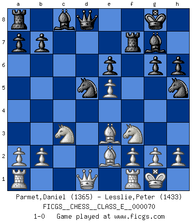 Last move : 1-0 2008 January 21 17:16:54 [Event "FICGS__CHESS__CLASS_E__000070"] [Site "FICGS"] [Date "2007.12.15"] [Round "1"] [White "Parmet,Daniel"] [Black "Lesslie,Peter"] [Result "1-0"] [WhiteElo "1365"] [BlackElo "1433"] 1.d4 Nf6 2.Nf3 g6 3.c4 Bg7 4.Nc3 O-O 5.e4 d6 6.Be2 Na6 7.O-O c5 8.d5 Nc7 9.Bg5 h6 10.Bf4 Nh5 11.Be3 e5 12.dxe6 fxe6 13.e5 d5 14.Bxc5 Rf7 15.cxd5 Nxd5 16.Be3 1-0 King's Indian : East Indian defense Kingside Castling by player Black (move 4) Kingside Castling by player White (move 7) Player White won this chess game. Follow this game move after move (download)Daring ideas are like Chess men moved forward. They may be beaten, but they may start a winning game. (Johann Wolfgang von Goethe) Die Auseinandersetzung mit Karpow war politisch geprägt. Er stand für das kommunistische System, wurde von dessen Repräsentanten gehätschelt. Ich war der Oppositionelle. Jeder Schachweltmeister spiegelt auch die gesellschaftlichen Verhältnisse wider. Kramnik steht für die Börsen-Generation des Neuen Markts, ideologiefrei, zahlenfixiert. (Garry Kasparov) En el Ajedrez, cuando menos, el valiente hereda la tierra. (Edmar Mednis) Soyez une menace à chaque fois que vous vous asseyez pour jouer. (Ken Smith) Life is like a ten-speed bicycle: most of us have gears we never use. (Charles M. Schulz)