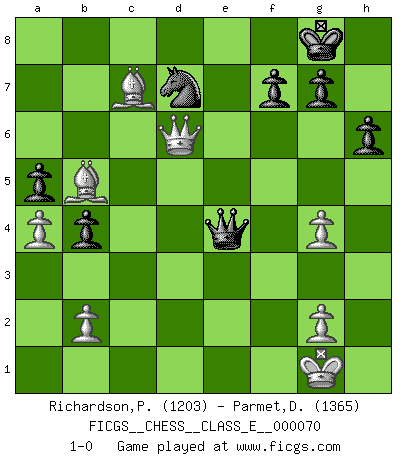 Last move : 1-0 2008 March 4 17:17:40 [Event "FICGS__CHESS__CLASS_E__000070"] [Site "FICGS"] [Date "2007.12.15"] [Round "1"] [White "Richardson,Patrick"] [Black "Parmet,Daniel"] [Result "1-0"] [WhiteElo "1203"] [BlackElo "1365"] 1.d4 d5 2.c4 c6 3.Nf3 Nf6 4.Nc3 dxc4 5.e3 b5 6.a4 b4 7.Na2 e6 8.Bxc4 Bb7 9.Bd2 a5 10.O-O c5 11.Nc1 cxd4 12.Nxd4 Nbd7 13.f4 Rc8 14.Qe2 Bc5 15.Ncb3 Bb6 16.Rac1 O-O 17.Rfd1 Re8 18.Be1 e5 19.fxe5 Nxe5 20.Nf5 Nfd7 21.Bb5 Rxc1 22.Nxc1 Qc7 23.Nd3 Be4 24.Nxe5 Bxf5 25.Nc4 Bc5 26.Bg3 Qa7 27.Bd6 Bb6 28.Nxb6 Qxb6 29.Bf4 Re7 30.Rd6 Qd8 31.Qc4 Be6 32.Qc6 h6 33.Rd4 Bf5 34.e4 Bg4 35.Bc7 Qc8 36.Qd6 Qb7 37.h3 Rxe4 38.Rxe4 Qxe4 39.hxg4 1-0 QGD Slav : 5.e3 (Alekhine variation) Kingside Castling by player White (move 10) Kingside Castling by player Black (move 16) Player White won this chess game. Follow this game move after move (download)You know you're going to lose. Even when I was ahead I knew I was going to lose. - On playing against Fischer. (Andrew Soltis) Mein Gehirn das ist mein zweitwichtigstes Organ [Aus dem Film: Der Schläfer]. (Woody Allen) Cada Peón es potencialmente una Reina. (James Mason) Aux échecs, l'amour-propre est satisfait quand on remporte la victoire, mais il n'y a pas de honte à être battu. (Benjamin Franklin) A woman without a man is like a fish without a bicycle. (Gloria Steinem)