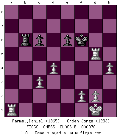 Last move : 1-0 2008 February 19 11:53:56 [Event "FICGS__CHESS__CLASS_E__000070"] [Site "FICGS"] [Date "2007.12.15"] [Round "1"] [White "Parmet,Daniel"] [Black "Orden,Jorge"] [Result "1-0"] [WhiteElo "1365"] [BlackElo "1283"] 1.d4 d5 2.Nf3 Nf6 3.c4 e6 4.Nc3 Bb4 5.a3 Bxc3+ 6.bxc3 O-O 7.Bg5 h6 8.Bxf6 Qxf6 9.e3 dxc4 10.Bxc4 a6 11.Qd3 b5 12.Ba2 Bb7 13.Bb1 g6 14.e4 Rd8 15.Qe3 Kg7 16.O-O Nc6 17.a4 bxa4 18.Rxa4 a5 19.e5 Qe7 20.Be4 f5 21.exf6+ Qxf6 22.Ne5 Ra6 23.Nxg6 Rb8 24.Qg3 Qd8 25.Ne7 Kf8 26.Nxc6 Bxc6 27.Bxc6 Rxc6 28.Qf3+ Kg7 29.Qxc6 Rb6 30.Qf3 Ra6 31.Rfa1 c6 32.Qg3+ Qg5 33.Qxg5+ hxg5 34.Rxa5 Rb6 35.Rxg5+ Kf6 36.h4 1-0 Queen's pawn game Kingside Castling by player Black (move 6) Kingside Castling by player White (move 16) Player White won this chess game. Follow this game move after move (download)The isolated Pawn casts gloom over the entire chessboard. (Aaron Nimzovich) Das Schachspiel ist ein See, in welchem eine Mücke baden und ein Elefant ertrinken kann. (Emanuel Lasker) El ganar no lo es todo... pero el perder es nada. (Mednis) C'est une question de caractère, Beaucoup de gens perdent leur motivation très vite. D'autres, ils sont rares, peuvent la conserver très longtemps. J'aime les échecs, encore aujourd'hui je suis heureux d'analyser des parties. J'aime toujours gagner, je déteste encore perdre. Bien jouer est important pour mon intégrité intellectuelle et morale. Et puis les échecs vivent en ce moment une période historique grâce à Internet. Ils se développent dans les systèmes éducatifs à travers le monde. Ils sortent de leur ghetto, et c'est mon rôle de mener à bien cette révolution. (Gary Kasparov) There's no money in correspondence chess. (John Knudsen)