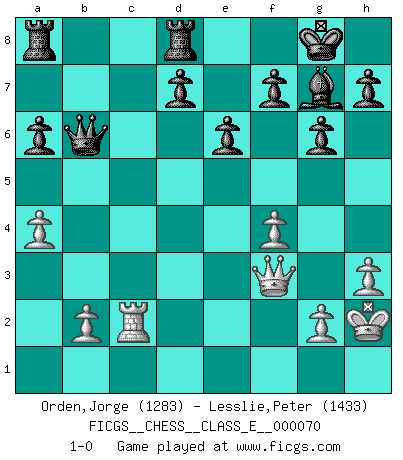 Last move : 1-0 2008 January 21 1:6:17 [Event "FICGS__CHESS__CLASS_E__000070"] [Site "FICGS"] [Date "2007.12.15"] [Round "1"] [White "Orden,Jorge"] [Black "Lesslie,Peter"] [Result "1-0"] [WhiteElo "1283"] [BlackElo "1433"] 1.e4 e6 2.Nf3 c5 3.d4 cxd4 4.Nxd4 a6 5.Bc4 Nf6 6.Nc3 Bb4 7.Bg5 Qa5 8.O-O Qxg5 9.Nde2 O-O 10.a3 Be7 11.h3 b5 12.Bb3 Bb7 13.Ng3 Rd8 14.a4 b4 15.Nce2 Nxe4 16.Nxe4 Bxe4 17.f3 Bb7 18.Kh2 Qe5+ 19.f4 Qc7 20.c3 bxc3 21.Nxc3 g6 22.Qg4 Bf8 23.Rac1 Nc6 24.Ne4 Bg7 25.Ng5 Qb6 26.Rf3 Nd4 27.Rfc3 Nxb3 28.R1c2 Nd4 29.Nf3 Nxc2 30.Rxc2 Bxf3 31.Qxf3 1-0 French defense Kingside Castling by player White (move 8) Kingside Castling by player Black (move 9) Player White won this chess game. Follow this game move after move (download)Fischer Chess play was always razor-sharp, rational and brilliant. One of the best ever. (Dave Regis) Es gibt keine einzige Frau, der ich nicht einen Springer vorgeben könnte und trotzdem gewänne. (Robert James Fischer) Cuando le juegas a Fischer, no es una cuestion de si vas a ganar o perder. Es una cuestion de si vas a sobrevivir. (Boris Spassky) Tous ces prétendus hommes politiques sont les pions, les Cavaliers, les Tours ou les Fous d'une partie d'échecs qui se jouera tant qu'un hasard ne renversera pas l'échiquier. (Honoré de Balzac) Before all elsed, be armed. (Niccolo Machiavelli)