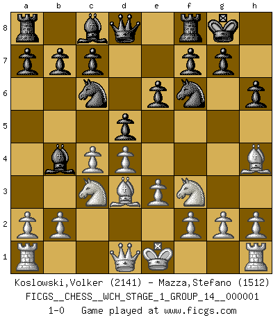 Last move : 1-0 2006 August 15 5:50:41 [Event "FICGS__CHESS__WCH_STAGE_1_GROUP_14__000001"] [Site "FICGS"] [Date "2006.07.01"] [Round "1"] [White "Koslowski,Volker"] [Black "Mazza,Stefano"] [Result "1-0"] [WhiteElo "2141"] [BlackElo "1512"] 1.d4 d5 2.c4 e6 3.Nf3 Nc6 4.Nc3 Bb4 5.Bg5 Nf6 6.e3 O-O 7.Bd3 h6 8.Bh4 1-0 This chess game has been lost on time (started : 2006.07.01 16:18:52) Queen's gambit declined Kingside Castling by player Black (move 6) Player White won this chess game. Follow this game move after move (download)I give 98 percent of my mental energy to Chess. Others give only 2 percent. (Bobby Fischer) Dein Körper muss in Topform sein. Dein Schach verfällt, wenn dein Körper verfällt. Der Körper kann nicht vom Geist getrennt werden. (Robert James Fischer) Dios mío, Bobby Fischer juega tan simple. (Alexei Suetin) Plusieurs personnes se sont demandées comment Tal faisait pour gagner... En fait, c'est très simple ! Il met ses pièces au centre de l'échiquier et les sacrifie quelque part ! (David Bronstein) They say in chess you've got to kill the queen, and then you mate it... Oh I, do you ? (Red Hot Chili Peppers, Fortune faded)