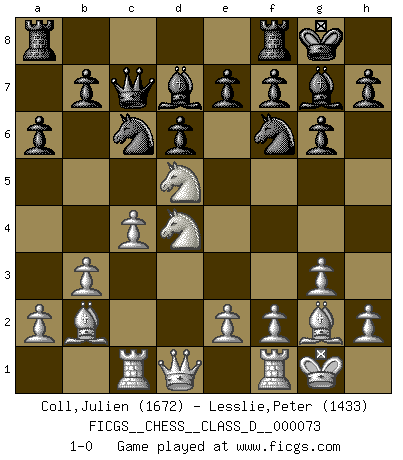 Last move : 1-0 2008 January 21 17:17:44 [Event "FICGS__CHESS__CLASS_D__000073"] [Site "FICGS"] [Date "2007.12.17"] [Round "1"] [White "Coll,Julien"] [Black "Lesslie,Peter"] [Result "1-0"] [WhiteElo "1672"] [BlackElo "1433"] 1.c4 Nf6 2.Nf3 g6 3.g3 Bg7 4.Bg2 O-O 5.O-O d6 6.Nc3 c5 7.d4 cxd4 8.Nxd4 a6 9.b3 Qc7 10.Bb2 Bd7 11.Rc1 Nc6 12.Nd5 1-0 English Opening Kingside Castling by player Black (move 4) Kingside Castling by player White (move 5) Player White won this chess game. Follow this game move after move (download)You know, comrade Pachman, I don't enjoy being a Minister, I would rather play Chess like you. (Che Guevara) Wie, soll nun auch die Opposition abgeschafft werden? Ja, es tut mir leid, Ihnen diesen Schmerz nicht ersparen zu können. (Aaron Nimzowitsch) Me siento como si fuera una pieza en una partida de Ajedrez, cuando mi oponente me indica: esa pieza no puede ser movida. (Soren Kierkegaard) Il s'avisa de me proposer d'apprendre les échecs qu'il jouait un peu... me voilà forcené des échecs. J'achète un échiquier, je m'enferme dans ma chambre, j'y passe des jours et des nuits à vouloir apprendre par cur toutes les parties. (Jean-Jacques Rousseau, Confessions) Watch your thoughts; they become words. Watch your words; they become actions. Watch your actions; they become habits. Watch your habits; they become character. Watch your character; it becomes your destiny. (Frank Outlaw)