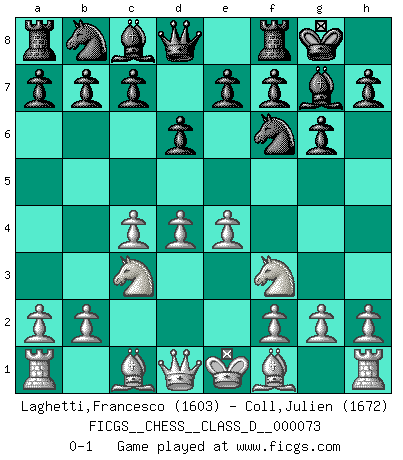 Last move : 0-1 2008 February 4 12:39:25 [Event "FICGS__CHESS__CLASS_D__000073"] [Site "FICGS"] [Date "2007.12.17"] [Round "1"] [White "Laghetti,Francesco"] [Black "Coll,Julien"] [Result "0-1"] [WhiteElo "1603"] [BlackElo "1672"] 1.d4 Nf6 2.c4 g6 3.Nc3 Bg7 4.e4 d6 5.Nf3 O-O 0-1 This chess game has been lost on time (started : 2007.12.17 19:50:45) King's Indian : 5.Nf3 Kingside Castling by player Black (move 5) Player Black won this chess game. Follow this game move after move (download)Becoming successful at Chess allows you to discover your own personality. That's what I want for the kids I teach. (Saudin Robovic) Ein Remis kann durch Wiederholung von drei Zügen oder durch einen schlechte Zug erreicht werden. (Savielly Grigorievitsch Tartakower) Yo tuve un dolor de muelas en la primer partida. En el segundo juego, tuve un dolor de cabeza. En el tercero, tuve un ataque de reumatísmo. En la cuarta partida, no me sentía muy bien. ¿Y en el quinto juego? Bueno, ¿que acaso uno tiene que ganar todos los juegos?. (Siegbert Tarrasch) D'abord les bases : Jouez et étudiez, puis étudiez et jouez, ensuite jouez et étudiez, puis étudiez et jouez. Deuxièmement : Donnez toujours le meilleur de vous-même ! (Ken Smith) If computers get too powerful, we can organize them into committees. That'll do them in. (Anonymous)