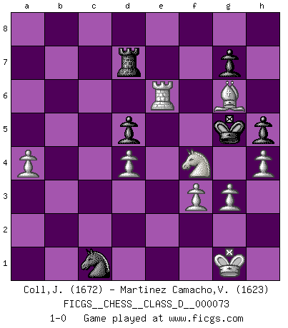 Last move : 1-0 2008 June 24 21:1:13 [Event "FICGS__CHESS__CLASS_D__000073"] [Site "FICGS"] [Date "2007.12.17"] [Round "1"] [White "Coll,Julien"] [Black "Martinez Camacho,Victor Hugo"] [Result "1-0"] [WhiteElo "1672"] [BlackElo "1623"] 1.e4 c6 2.d4 d5 3.exd5 cxd5 4.c4 e6 5.Nc3 Nf6 6.Nf3 Bb4 7.cxd5 exd5 8.Bd3 O-O 9.O-O Bg4 10.Bg5 Be7 11.h3 Be6 12.Re1 Nbd7 13.Rc1 h6 14.Bh4 Rc8 15.Bg3 Nb6 16.Qe2 Qd7 17.Ne5 Qd8 18.Nxf7 Bxf7 19.Qxe7 Qxe7 20.Rxe7 Rfe8 21.Rxb7 Nc4 22.b3 Nd2 23.Rxa7 Nde4 24.Bc7 Ra8 25.Rxa8 Rxa8 26.a4 Ra7 27.Ne2 Rb7 28.Be5 Be8 29.Rc8 Kf7 30.f3 Nd2 31.Nf4 Nxb3 32.Ra8 Nc1 33.Bg6+ Ke7 34.Bxf6+ Kxf6 35.Rxe8 Rd7 36.Re6+ Kg5 37.g3 h5 38.h4+ 1-0 Caro-Kann : Panov-Botvinnik attack Kingside Castling by player Black (move 8) Kingside Castling by player White (move 9) Player White won this chess game. Follow this game move after move (download)I believe that Chess possesses a magic that is also a help in advanced age. A rheumatic knee is forgotten during a game of Chess and other events can seem quite unimportant in comparison with a catastrophe on the chessboard. (Vlastimil Hort) Früher wurde jeder komplizierte Zug, jedes interessante Opfer mit großem Beifall und Enthusiasmus aufgenommen. Heute schaltet man einfach seinen Fritz an, und man kann sehen, was los ist, ob der Zug geht oder nicht. (Vladimir Kramnik) Bobby Fischer es el mas grande genio de Ajedrez de todos los tiempos. (Alexander Kotov) Les Echecs sont affaire de jugement sensible. Savoir quand frapper et quand esquiver. (Fischer) Somehow our devils are never quite what we expect when we meet them face to face. (Nelson DeMille)