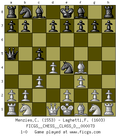 Last move : 1-0 2008 February 5 12:43:48 [Event "FICGS__CHESS__CLASS_D__000073"] [Site "FICGS"] [Date "2007.12.17"] [Round "1"] [White "Menzies,Colin"] [Black "Laghetti,Francesco"] [Result "1-0"] [WhiteElo "1553"] [BlackElo "1603"] 1.d4 Nf6 2.Bg5 Ne4 3.Bf4 c5 4.f3 Qa5+ 5.c3 1-0 This chess game has been lost on time (started : 2007.12.17 19:50:45) Trompowsky attack (Ruth, Opovcensky Opening) Player White won this chess game. Follow this game move after move (download)Personally, I rather look forward to a computer program winning the world Chess Championship. Humanity needs a lesson in humility. (Richard Dawkings) Wenn Du nicht kämpfst, um anderen etwas zu beweisen, sondern nur für Dich selbst, dann bist du fast unbesiegbar. (Garry Kasparov) ¿Quién es tu oponente esta tarde? Esta tarde mi oponente son las piezas negras. (Akiba Rubinstein) Les Cavaliers se révèlent fort utiles dans les positions fermées. D'habitude, les Fous sont un peu plus forts que les Cavaliers dans les positions ouvertes. Qu'on le veuille ou non, il restera toujours des exceptions ! No, no, you're not thinking; you're just being logical. (Niels Bohr)