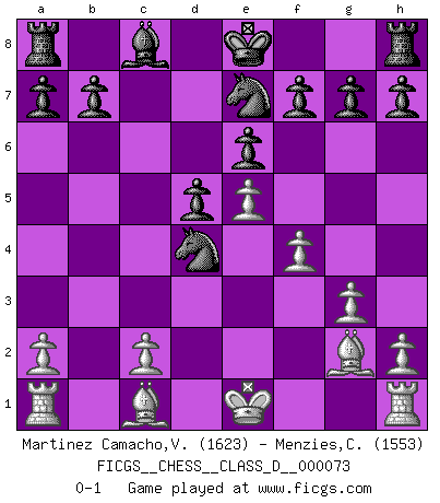 Last move : 0-1 2008 January 18 18:16:3 [Event "FICGS__CHESS__CLASS_D__000073"] [Site "FICGS"] [Date "2007.12.17"] [Round "1"] [White "Martinez Camacho,Victor Hugo"] [Black "Menzies,Colin"] [Result "0-1"] [WhiteElo "1623"] [BlackElo "1553"] 1.e4 e6 2.d4 d5 3.Nc3 Bb4 4.e5 c5 5.Nge2 Nc6 6.f4 Nge7 7.g3 Qa5 8.Bg2 cxd4 9.Nxd4 Bxc3+ 10.bxc3 Qxc3+ 11.Qd2 Qxd4 12.Qxd4 Nxd4 0-1 French : Winawer, Advance variation Player Black won this chess game. Follow this game move after move (download)Checkers is for tramps. (Paul Morphy) Wenn Capablanka heute auf der Schachbühne erscheinen würde, hätte er ein halbes Jahr gebraucht um sich die Schachtheorie anzueignen. Und dann hätte er alles und jeden besiegt. (Mikhail Moiseyevich Botvinik) El Ajedrez es parte de la cultura, y si una cultura esta en decadencia, entonces también el Ajedrez declinará. (Mikhail Botvinnik) Il (Jacob Murray) ne joue pas pour le bon coup, mais pour le meilleur. (Eloi Relange) First of all, we have to go back to the classical time control. (Anatoly Karpov)