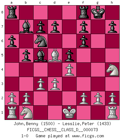 Last move : 1-0 2008 April 11 7:18:41 [Event "FICGS__CHESS__CLASS_D__000073"] [Site "FICGS"] [Date "2007.12.17"] [Round "1"] [White "John,Benny"] [Black "Lesslie,Peter"] [Result "1-0"] [WhiteElo "1500"] [BlackElo "1433"] 1.e4 e5 2.Bc4 Nf6 3.d3 Bc5 4.Qf3 O-O 5.Bg5 Nc6 6.Bxf6 Qxf6 7.Qxf6 gxf6 8.c3 a6 9.Nf3 b5 10.Bd5 Bb7 11.Nh4 1-0 Bishop's Opening : Berlin defense Kingside Castling by player Black (move 4) Player White won this chess game. Follow this game move after move (download)The hallmark of the artist is simplicity. (Larry Evans) Ein Gewinn durch eine ungenaue Kombination, sei sie auch noch so vorzeigbar, erfüllt mich mit Schaudern. (Wilhelm Steinitz) Fischer era un maestro de claridad y un Rey del posicionamiento astuto. Sus oponentes podían ver hacia donde se dirigía pero eran impotentes para detenerlo. (Bruce Pandolfini) On croit qu'il y a plus de mauvais joueurs que de bons joueurs, c'est faux : Il y a autant de joueurs qui gagnent que de joueurs qui perdent. (Philippe Geluck) O divine art of subtlety and secrecy! Through you we learn to be invisible, through you inaudible and hence we can hold the enemy's fate in our hands. (Sun Tzu)