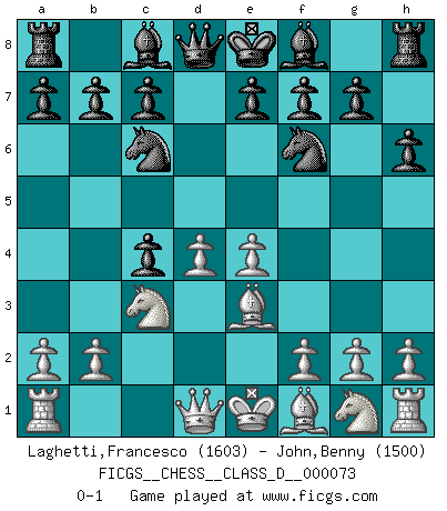 Last move : 0-1 2008 February 2 12:27:45 [Event "FICGS__CHESS__CLASS_D__000073"] [Site "FICGS"] [Date "2007.12.17"] [Round "1"] [White "Laghetti,Francesco"] [Black "John,Benny"] [Result "0-1"] [WhiteElo "1603"] [BlackElo "1500"] 1.d4 d5 2.c4 dxc4 3.e4 Nc6 4.Be3 Nf6 5.Nc3 h6 0-1 This chess game has been lost on time (started : 2007.12.17 19:50:45) QGA : 3.e4 Player Black won this chess game. Follow this game move after move (download)When I asked Fischer why he had not played a certain move in our game, he replied: 'Well, you laughed when I wrote it down !' (Mikhail Tal) Wer sich die Fähigkeit anerziehen will im Schach selbstständig zu denken, der muß alles meiden, was leblos ist: ausgeklügelte Theorien, die sich auf sehr wenige Beispiele und eine Menge Hirngespinste stützen. (Emanuel Lasker) Con o sin el título, Bobby Fischer fue sin lugar a dudas el mas grande jugador de su época. (Burt Hochberg) J'ai vu le vaincu d'Echecs jouer des années durant dans l'espoir de la fête de la victoire. Car tu es plus riche de ce qu'elle existe si même elle n'est point pour toi. Ainsi de la perle du fond des mers. (Antoine de Saint-Exupéry) If only faces could talk... (Pat Summerall, Sportscaster during the Super Bowl)