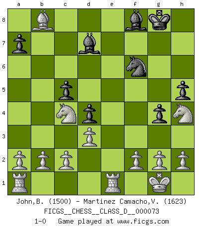 Last move : 1-0 2008 May 9 14:52:45 [Event "FICGS__CHESS__CLASS_D__000073"] [Site "FICGS"] [Date "2007.12.17"] [Round "1"] [White "John,Benny"] [Black "Martinez Camacho,Victor Hugo"] [Result "1-0"] [WhiteElo "1500"] [BlackElo "1623"] 1.e4 c6 2.Bc4 d5 3.exd5 cxd5 4.Bb3 Nf6 5.d3 e6 6.Qf3 Be7 7.Qg3 g6 8.Nf3 Nc6 9.O-O Bd6 10.Qh4 Nh5 11.Ba4 Qxh4 12.Nxh4 O-O 13.Bxc6 bxc6 14.Be3 f5 15.Nd2 f4 16.Bd4 e5 17.Bc3 d4 18.Ba5 g5 19.Nhf3 h6 20.Nc4 Rd8 21.Bxd8 Bf8 22.Ncxe5 c5 23.Rfe1 Bf5 24.Ba5 Nf6 25.Nc4 g4 26.Nh4 Bd7 27.Bd2 Rb8 28.Bxf4 h5 29.Bxb8 1-0 Caro-Kann : Hillbilly attack Kingside Castling by player White (move 9) Kingside Castling by player Black (move 12) Player White won this chess game. Follow this game move after move (download)Good positions don't win games, good moves do. (Gerald Abrahams) Schach ist mein Leben, meine Leidenschaft, was ich gelernt habe und seit meinem 14. Lebensjahr profimässig praktiziere. Darauf zu verzichten, würde mir sehr schwer fallen. (Viktor Kortschnoi) El Ajedrez es una hermosa aventura. (Bent Larsen) Il vaut mieux sacrifier les pièces de l'adversaire. (Xavier Tartacover) Think like a man of action, act like a man of thought. (Henri Louis Bergson)