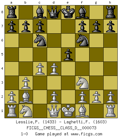Last move : 1-0 2008 February 1 0:20:47 [Event "FICGS__CHESS__CLASS_D__000073"] [Site "FICGS"] [Date "2007.12.17"] [Round "1"] [White "Lesslie,Peter"] [Black "Laghetti,Francesco"] [Result "1-0"] [WhiteElo "1433"] [BlackElo "1603"] 1.Nf3 d5 2.c4 d4 3.e3 Nc6 4.b3 e5 5.Bb2 Nf6 6.exd4 1-0 This chess game has been lost on time (started : 2007.12.17 19:50:45) Reti : Advance variation Player White won this chess game. Follow this game move after move (download)White lost because he failed to remember the right continuation and had to think up the moves himself. (Siegbert Tarrasch) Sitze auf Deine Hände. (Siegbert Tarrasch) El Ajedrez es en su esencia, un juego. En su forma, un arte. Y en su ejecución, una ciencia. (Baron Tassilo) Echiquier : carré parfait, comme la Jérusalem nouvelle décrite par l'auteur de l'Apocalypse, huit cases sur huit, exaltation du chiffre 4, symbole du cosmos aux quatre horizons... où le noir et le blanc, l'ombre et la lumière, le mal et le bien s'entremêlent et se conjuguent. (Robert Couffignal, Le Gambit du poète) Without enthusiasm, virtue functions not at all, and vice only poorly. (Mignon McLaughlin, The Neurotic's Notebook, 1960)