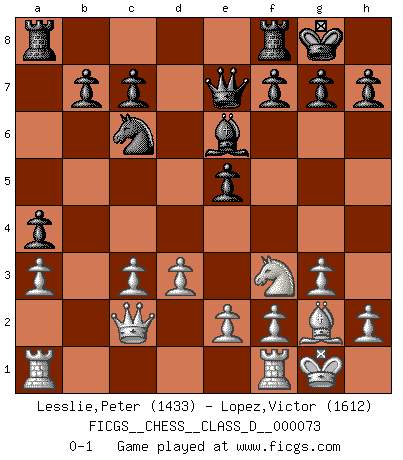 Last move : 0-1 2008 January 21 1:6:7 [Event "FICGS__CHESS__CLASS_D__000073"] [Site "FICGS"] [Date "2007.12.17"] [Round "1"] [White "Lesslie,Peter"] [Black "Lopez,Victor"] [Result "0-1"] [WhiteElo "1433"] [BlackElo "1612"] 1.c4 e5 2.d3 Nf6 3.Nf3 Nc6 4.g3 Bb4+ 5.Nc3 d5 6.cxd5 Nxd5 7.Bd2 O-O 8.Bg2 Nxc3 9.Bxc3 Qe7 10.O-O a5 11.a3 Bxc3 12.bxc3 a4 13.Qc2 Be6 0-1 English Opening Kingside Castling by player Black (move 7) Kingside Castling by player White (move 10) Player Black won this chess game. Follow this game move after move (download)My style is somewhere between that of Tal and Petrosian. (Reshevsky) Ein Großmeister muß tausende Partien in seinem Kopf speichern, denn diese sind für Ihn, was die Worte der Muttersprache für gewöhnliche Leute sind, oder Noten für Musiker... (Garry Kasparov) Las combinaciones han sido siempre el aspecto más intrigante del Ajedrez. Los Maestros las buscan, el público las aplauden, los críticos las alaban. La razón se debe a que las combinaciones hacen posible que el Ajedrez sea más que un ejercicio matemático con una carencia de vida. Ellas son la poesía del juego, son del Ajedrez lo que la melodía es de la música. Ellas representan el triunfo de la mente sobre la materia. (Reuben Fine) Si je n'étais pas joueur d'échecs, je serais le meilleur dans quelque chose d'autre. (Anatoli Karpov) The Internet is the first thing that humanity has build that humanity doesn't understand, the largest experiment in anarchy that we have ever had. (Eric Schmidt)