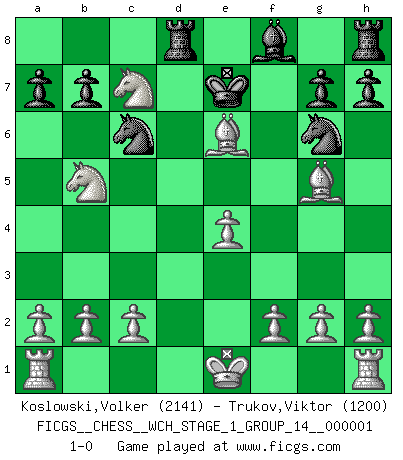 Last move : 1-0 2006 August 20 6:24:40 [Event "FICGS__CHESS__WCH_STAGE_1_GROUP_14__000001"] [Site "FICGS"] [Date "2006.07.01"] [Round "1"] [White "Koslowski,Volker"] [Black "Trukov,Viktor"] [Result "1-0"] [WhiteElo "2141"] [BlackElo "1200"] 1.e4 e5 2.Nf3 d5 3.exd5 e4 4.Qe2 Nf6 5.Nc3 Nxd5 6.Qxe4+ Ne7 7.Bc4 Qd6 8.Ng5 Be6 9.Nxe6 Nbc6 10.Nb5 Qe5 11.Nexc7+ Kd7 12.d3 Rd8 13.Bxf7 Qxe4 14.dxe4 Ng6 15.Be6+ Ke7 16.Bg5+ 1-0 QP counter-gambit (elephant gambit) Player White won this chess game. Follow this game move after move (download)All that matters on the Chessboard is good moves. (Bobby Fischer) Wer nie einen Fehler gemacht hat, hat nie etwas Neues ausprobiert. (Albert Einstein) Las Aperturas te enseñan aperturas. ¡Los Finales te enseñan Ajedrez!. (Stephan Gerzadowicz) Il n'y a pas eu de défaite parce que je ne crois pas que cet ordinateur ait jamais existé. IBM a triché en refusant d'imprimer les modes de recherche de la machine. C'est évident, pendant le match, des coups décisifs ont été joués par des êtres humains. Aujourd'hui, les meilleurs spécialistes en informatique ne peuvent toujours pas expliquer comment Deep-Blue a pu jouer contre la logique des ordinateurs. IBM a gagné une guerre de communication, mais ils sont incapables de prouver que l'ordinateur a gagné tout seul. (Garry Kasparov) Life is like internet, nothing interesting, but noone want to leave it. (Ilmars Cirulis)