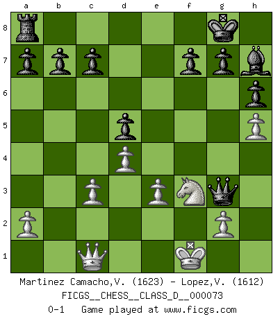 Last move : 0-1 2008 January 23 17:17:31 [Event "FICGS__CHESS__CLASS_D__000073"] [Site "FICGS"] [Date "2007.12.17"] [Round "1"] [White "Martinez Camacho,Victor Hugo"] [Black "Lopez,Victor"] [Result "0-1"] [WhiteElo "1623"] [BlackElo "1612"] 1.e4 e5 2.Nf3 Nf6 3.Nxe5 d6 4.Nf3 Nxe4 5.d4 d5 6.Bd3 Nc6 7.Be3 Bf5 8.O-O Bd6 9.Nbd2 O-O 10.Re1 Re8 11.c3 Nxc3 12.bxc3 Bxd3 13.Nf1 Bg6 14.Ng3 h6 15.Qd2 Na5 16.h4 Nc4 17.Qc1 Ba3 18.Qd1 Bb2 19.h5 Bh7 20.Rc1 Qd6 21.Kf1 Nxe3+ 22.Rxe3 Rxe3 23.fxe3 Bxc1 24.Qxc1 Qxg3 0-1 Petrov : Classical attack Kingside Castling by player White (move 8) Kingside Castling by player Black (move 9) Player Black won this chess game. Follow this game move after move (download)The beauty of a move lies not in its' appearance but in the thought behind it. (Siegbert Tarrasch) Rauchen ist dem Schachspieler bei seiner Arbeit, also im Wettkampf, untersagt. (Viktor Kortschnoi) El Ajedrez lo es todo: arte, ciencia y deporte. (Anatoly Karpov) La tactique est l'élément le plus important du milieu de jeu. (Siegbert Tarrasch) Do you know these so called Volunteers don't even get paid! (Simpsons)
