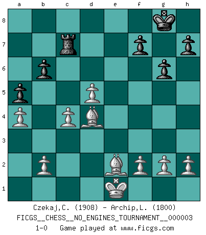 Last move : 1-0 2008 May 11 21:33:31 [Event "FICGS__CHESS__NO_ENGINES_TOURNAMENT__000003"] [Site "FICGS"] [Date "2007.12.19"] [Round "1"] [White "Czekaj,Christophe"] [Black "Archip,Laurentiu"] [Result "1-0"] [WhiteElo "1908"] [BlackElo "1800"] 1.e4 e5 2.Nf3 Nf6 3.Nxe5 Nxe4 4.Qe2 d5 5.d3 Qe7 6.dxe4 Qxe5 7.exd5 Qxe2+ 8.Bxe2 Bc5 9.O-O O-O 10.Nc3 Na6 11.Ne4 b6 12.Bf4 Nb4 13.c4 Bf5 14.Ng3 Nc2 15.Nxf5 Nxa1 16.Rxa1 Bd6 17.Nxd6 cxd6 18.Bxd6 Rfe8 19.Bf3 a5 20.a4 g6 21.Rc1 Ra7 22.Kf1 Rd8 23.Be5 Re8 24.Bd4 Rb7 25.Re1 Rxe1+ 26.Kxe1 Rc7 27.Be2 1-0 Petrov : Damiano variation Kingside Castling by player White (move 9) Kingside Castling by player Black (move 9) Player White won this chess game. Follow this game move after move (download)A man without frontiers. He didn't divide the East and the West, he brought them together in their admiration for him. (Ljubomir Ljubojevic, about Bobby Fischer's death) Privat ist Kortschnoi kein schlechter Mensch, sehr sympathisch. Aber während des Spiels ist er grausam. Er will dich töten. (Miguel Najdorf) Las piezas de Ajedrez son los bloques del alfabeto que moldean los pensamientos; y esos pensamientos, aunque hagan un diseño visual en el tablero, expresan abstractamente su belleza como un poema. (Marcel Duchamp) La tactique, c'est ce que vous faites quand il y a quelque chose à faire; la stratégie, c'est ce que vous faites quand il n'y a rien à faire. (Savielli Tartacower) Horse racing is animated roulette. (Roger Kahn)