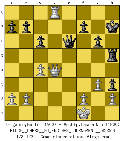 Last move : 1/2-1/2 2008 February 11 21:13:57 [Event "FICGS__CHESS__NO_ENGINES_TOURNAMENT__000003"] [Site "FICGS"] [Date "2007.12.19"] [Round "1"] [White "Trigance,Emile"] [Black "Archip,Laurentiu"] [Result "1/2-1/2"] [WhiteElo "1600"] [BlackElo "1800"] 1.e4 e5 2.Nf3 Nf6 3.d4 Nxe4 4.Bd3 d5 5.Nxe5 Bd6 6.O-O O-O 7.c4 Nf6 8.Bg5 Be7 9.Nc3 Ne4 10.Bxe7 Qxe7 11.Nxe4 dxe4 12.Bxe4 c6 13.Re1 Qg5 14.Re3 Nd7 15.Qe2 Nxe5 16.dxe5 Bf5 17.Rg3 Qf4 18.Bxf5 Qxf5 19.Re1 Rae8 20.Re3 Re6 21.Rd1 Rfe8 22.Rd7 h5 23.g3 Rxe5 24.Rxe5 Rxe5 25.Qd1 Qe6 26.Qd3 g6 27.Kg2 h4 28.Rd8+ Kg7 29.Qd4 h3+ 30.Kf1 Kh7 31.Qh4+ Rh5 32.Qd4 Re5 33.Qh4+ Rh5 34.Qd4 1/2-1/2 Petrov : Modern attack, Symmetrical variation Kingside Castling by player White (move 6) Kingside Castling by player Black (move 6) This chess game ended in a draw. Follow this game move after move (download)What is the difference between chess and football? Everybody understands football, but nobody plays it. Everybody plays chess, but nobody understands it. Everything is relative. (Vladimir Kramnik) Du musst Deinen Gegner in einen tiefen dunklen Wald führen wo 2+2=5 ist und wo der Weg, der wieder hinausführt, nur breit genug für einen ist. (Mikhail Nekhemyevich Tal) Todos los jugadores de Ajedrez deberían tener un pasatiempo. (Savielly Tartakower) Une platitude souvent récitée à propos des Echecs est qu'une des choses les plus difficiles à réaliser est de gagner une position gagnante. Cela ne manque pas de sens mais, pour ma part, j'ai toujours trouvé plus difficile de gagner une position perdante. (Tim Krabbe) Always two there are. No more no less. A master, and an apprentice. (Master Yoda in Star Wars ep.1)