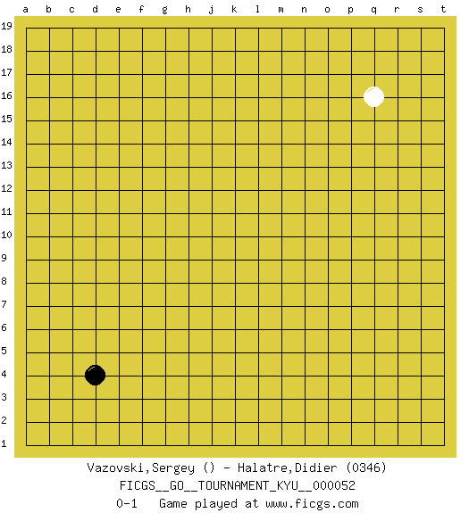 Last move : 0-1 2008 January 6 9:52:34 [Event "FICGS__GO__TOURNAMENT_KYU__000052"] [Site "FICGS"] [Date "2007.12.19"] [Round "1"] [Black "Vazovski,Sergey"] [White "Halatre,Didier"] [Result "0-1"] [Rating 2 "0346"] 1.d4 q16 0-1 Here are the names of the openings (joseki) played in the four corners : Player White won this Go (weiqi, baduk) game. Follow this game move after move (download)Six eyes in a rectangle are alive. (Anonymous) There are two kinds of people in the world, my friend. Those who have a loaded gun and those who dig. You dig ! (Blondie in The Good, The Bad and The Ugly)