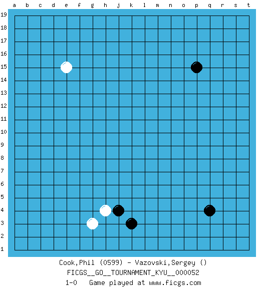 Last move : 1-0 2007 December 31 1:30:36 [Event "FICGS__GO__TOURNAMENT_KYU__000052"] [Site "FICGS"] [Date "2007.12.19"] [Round "1"] [Black "Cook,Phil"] [White "Vazovski,Sergey"] [Result "1-0"] [Rating 1 "0599"] 1.q4 e15 2.p15 g3 3.k3 h4 4.j4 1-0 Here are the names of the openings (joseki) played in the four corners : Player Black won this Go (weiqi, baduk) game. Follow this game move after move (download)In the opening, when you don't know what to play, make a shimari. (Jansteen) If everyone is thinking alike, then somebody isn't thinking. (US General George S. Patton)