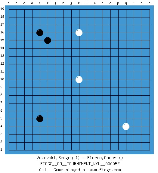 Last move : 0-1 2007 December 31 1:30:1 [Event "FICGS__GO__TOURNAMENT_KYU__000052"] [Site "FICGS"] [Date "2007.12.19"] [Round "1"] [Black "Vazovski,Sergey"] [White "Florea,Oscar"] [Result "0-1"] 1.e5 k10 2.e16 q4 3.f15 k16 0-1 Here are the names of the openings (joseki) played in the four corners : Player White won this Go (weiqi, baduk) game. Follow this game move after move (download)Everything would seem to be possible in Go. Like pulling a rabbit, by a magical move, out of a hat. (Pierre Audouard) There are 10 types of people in this world: those who understand binary and those who don't. (Anonymous)