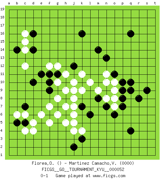 Last move : 0-1 2008 February 3 15:55:5 [Event "FICGS__GO__TOURNAMENT_KYU__000052"] [Site "FICGS"] [Date "2007.12.19"] [Round "1"] [Black "Florea,Oscar"] [White "Martinez Camacho,Victor Hugo"] [Result "0-1"] [Rating 2 "0000"] 1.k10 c16 2.q16 c4 3.d10 k4 4.q4 c12 5.q10 j10 6.h10 j9 7.h8 j8 8.k16 h7 9.h6 j7 10.j12 j6 11.l6 j5 12.j2 g6 13.f6 h5 14.n13 h9 15.d14 g8 16.o6 g10 17.f10 h11 18.f9 f7 19.q9 k11 20.p10 l10 21.p9 k9 22.s9 o7 23.r8 o8 24.k7 e6 25.m14 f5 26.p7 o9 27.n7 n8 28.n9 o10 29.p8 m9 30.m8 n10 31.o11 n11 32.c5 d4 33.e11 d5 34.b5 c6 35.k3 j4 36.c7 b6 37.d16 c14 38.b14 c15 39.g11 g12 40.f11 f12 0-1 Here are the names of the openings (joseki) played in the four corners : Player White won this Go (weiqi, baduk) game. Follow this game move after move (download)If you have won four corners, resign. (Anonymous) Thibault, I ask for draw. Game 13876. - Sorry Ilmars, you won. (FICGS chat)