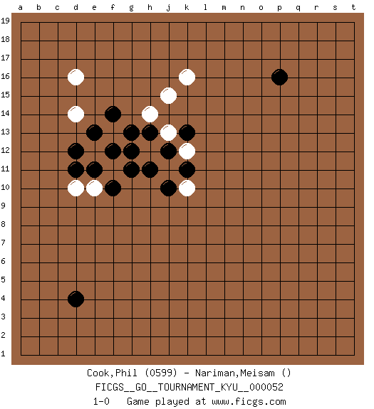 Last move : 1-0 2008 February 16 13:33:54 [Event "FICGS__GO__TOURNAMENT_KYU__000052"] [Site "FICGS"] [Date "2007.12.19"] [Round "1"] [Black "Cook,Phil"] [White "Nariman,Meisam"] [Result "1-0"] [Rating 1 "0599"] 1.d4 k10 2.d11 d16 3.f14 e12 4.e11 k16 5.p16 d10 6.f12 f13 7.e13 f11 8.g13 e10 9.d12 d14 10.g11 g12 11.f10 h12 12.j12 j13 13.h13 h14 14.h11 h12 15.g12 j15 16.k13 k12 17.k11 j11 18.j10 1-0 This go game has been lost on time (started : 2007.12.19 10:52:30) Here are the names of the openings (joseki) played in the four corners : Corner d16 : d11 d16 This joseki is unknown. A weak or weird move has probably been played in this corner. Corner d4 : d4 1-0 Hoshi (Hwajeom, Seongjeom, Xingwei`) 4-4 Point. The star or hoshi (4-4) point, emphasizing influence at the potential expense of territory. Player Black won this Go (weiqi, baduk) game. Follow this game move after move (download)When you study joseki, you lose two stones in strength. (Anonymous) Gambling : The sure way of getting nothing from something. (Wilson Mizner)