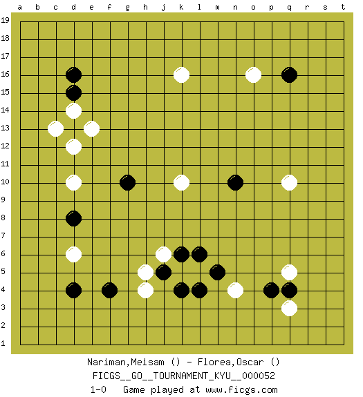 Last move : 1-0 2008 February 3 16:1:8 [Event "FICGS__GO__TOURNAMENT_KYU__000052 "] [Site "FICGS"] [Date "2007.12.19"] [Round "1"] [Black "Nariman,Meisam "] [White "Florea,Oscar "] [Result "1-0"] 1.d4 k10 2.k4 q10 3.q4 k16 4.q16 d10 5.d16 d6 6.g10 o16 7.d8 d12 8.d13 h4 9.l4 n4 10.f4 d14 11.n10 e13 12.d15 c13 13.m5 q3 14.j5 h5 15.k6 j6 16.l6 q5 17.p4 1-0 Here are the names of the openings (joseki) played in the four corners : Corner d4 : d4 d6Hoshi (Hwajeom, Seongjeom, Xingwei`) 4-4 Point. The star or hoshi (4-4) point, emphasizing influence at the potential expense of territory.Ikken Takagakari (Hankan Nop'dakeolch'im, Yi Gaojia, 1-Space High Approach). Black typically responds at 6-4 or 3-10. Black 4-10 is played when Black finds play on the right side advantageous. Black 4-8 or 3-8 may be played when Black has support at top. Corner q16 : q16 o16Hoshi (Hwajeom, Seongjeom, Xingwei`) 4-4 Point. The star or hoshi (4-4) point, emphasizing influence at the potential expense of territory.Ikken Takagakari (Hankan Nop'dakeolch'im, Yi Gaojia, 1-Space High Approach). Black typically responds at 6-4 or 3-10. Black 4-10 is played when Black finds play on the right side advantageous. Black 4-8 or 3-8 may be played when Black has support at top. Corner d16 : d16 d12Hoshi (Hwajeom, Seongjeom, Xingwei`) 4-4 Point. The star or hoshi (4-4) point, emphasizing influence at the potential expense of territory. Player Black won this Go (weiqi, baduk) game.Follow this game move after move (download ) Learning josekis by heart is useless if you don't try departing from them. (Pierre Audouard) Logic : The art of thinking and reasoning in strict accordance with the limitations and incapacities of the human misunderstanding. (Ambrose Bierce)