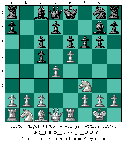 Last move : 1-0 2008 February 2 12:27:45 [Event "FICGS__CHESS__CLASS_C__000069"] [Site "FICGS"] [Date "2007.12.19"] [Round "1"] [White "Colter,Nigel"] [Black "Adorjan,Attila"] [Result "1-0"] [WhiteElo "1785"] [BlackElo "1944"] 1.e4 c5 2.Nf3 Nc6 3.Bb5 g6 4.O-O Bg7 5.Re1 e6 6.Bxc6 bxc6 7.e5 f6 8.d4 1-0 This chess game has been lost on time (started : 2007.12.19 14:58:9) Sicilian : Nimzovich-Rossolimo attack (with ...g6, without ...d6) Kingside Castling by player White (move 4) Player White won this chess game. Follow this game move after move (download)Chess is everything: art, science and sport. (Anatoly Karpov) Heutzutage gewinnt im Turnier nicht derjenige Spieler, der weitreichende Pläne entwirft, sondern einfach jener, der Zug um Zug kämpft. (David Bronstein) No todos los artistas son jugadores de Ajedrez, pero todos los jugadores de Ajedrez son artistas. (Marcel Duchamp) J'ai toujours senti une vague pitié pour l'homme qui ne connaît rien aux échecs, tout comme j'en aurais pour un homme ignorant de l'amour. Les Echecs, comme la musique ou comme l'amour, ont le pouvoir de rendre heureux. (Siegbert Tarrasch) Live, lose, and learn, by observing your opponent how to win. (Amber Steenbock)