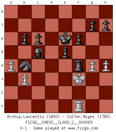 Last move : 0-1 2008 February 17 8:47:39 [Event "FICGS__CHESS__CLASS_C__000069"] [Site "FICGS"] [Date "2007.12.19"] [Round "1"] [White "Archip,Laurentiu"] [Black "Colter,Nigel"] [Result "0-1"] [WhiteElo "1800"] [BlackElo "1785"] 1.e4 c6 2.Nf3 d5 3.exd5 cxd5 4.d4 Nf6 5.Nc3 Bg4 6.Bf4 Nc6 7.Be2 e6 8.Ne5 Bxe2 9.Qxe2 Nxd4 10.Qd3 Nc6 11.Qb5 Qb6 12.Qxb6 axb6 13.Nb5 Ra4 14.Nc7+ Ke7 15.Nxc6+ bxc6 16.O-O Rxf4 17.c3 Ra4 18.b3 Ra7 19.Nxd5+ Nxd5 20.c4 Nb4 21.a4 Kf6 22.g3 Be7 23.Rfd1 Rd8 24.Kg2 Rad7 25.Rxd7 Rxd7 26.h4 Rd2 27.g4 Bc5 28.Kg3 Bxf2+ 29.Kf3 Bd4 30.Rf1 e5 31.c5 Bxc5 32.Ke4 Ke6 33.Rf5 f6 34.Rf1 Rd4+ 35.Kf3 Rf4+ 0-1 Caro-Kann defense Kingside Castling by player White (move 16) Player Black won this chess game. Follow this game move after move (download)A good player is always lucky. (Jose Raul Capablanca) Ein Schachgenie ist jemand der verdammt gut Schach spielt. (Jonathan Levitt) Siempre es mejor sacrificar los hombres de tu oponente. (Savielly Tartakower) Les échecs sont un jeu par leur forme, un art par leur essence et une science par sa difficulté d'acquisition. Ils peuvent vous procurer autant de plaisir qu'un bon livre ou une belle musique, mais vous n'aurez une réelle joie que si vous arrivez à bien jouer. (Tigran Petrosian) He who fights with monsters should be careful lest he thereby become a monster. (Friedrich Nietzsche, Beyond Good and Evil)