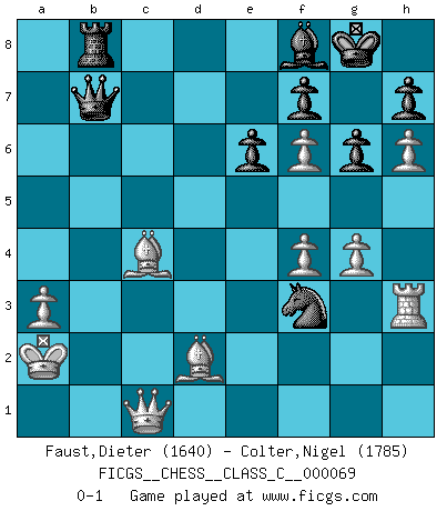 Last move : 0-1 2008 February 7 7:59:26 [Event "FICGS__CHESS__CLASS_C__000069"] [Site "FICGS"] [Date "2007.12.19"] [Round "1"] [White "Faust,Dieter"] [Black "Colter,Nigel"] [Result "0-1"] [WhiteElo "1640"] [BlackElo "1785"] 1.e4 c6 2.d4 d5 3.e5 Bf5 4.g4 Be4 5.f3 Bg6 6.Ne2 e6 7.h4 Bb4+ 8.c3 Be7 9.h5 Bh4+ 10.Kd2 Bg5+ 11.f4 Be4 12.Rh3 Be7 13.Ng3 Bxb1 14.Rxb1 c5 15.Qa4+ Nc6 16.dxc5 Bxc5 17.Bb5 Nge7 18.Bd3 a6 19.h6 g6 20.Qd1 Qc7 21.Kc2 b5 22.a3 Rb8 23.b4 Ba7 24.Kb2 O-O 25.Ka2 d4 26.cxd4 a5 27.bxa5 Qxa5 28.Ne4 Nd5 29.Nf6+ Nxf6 30.exf6 b4 31.Be4 Nxd4 32.Bd2 Qa6 33.Rxb4 Bc5 34.Rxb8 Rxb8 35.Qc1 Bf8 36.Bd3 Qb7 37.Bc4 Nf3 0-1 Caro-Kann : Advance variation Kingside Castling by player Black (move 24) Player Black won this chess game. Follow this game move after move (download)The boy (then a 12 year old boy named Anatoly Karpov) doesn't have a clue about Chess, and there's no future at all for him in this profession. (Mikhail Botvinnik) Das Schachspiel hat wie die Liebe, die Musik, die Fähigkeit, den Menschen glücklich zu machen. Ich habe ein leises Gefühl des Bedauerns für jeden, der das Schachspiel nicht kennt, so wie ich jeden bedaure, der die Liebe nicht kennt. (Siegbert Tarrasch) El Ajedrez es tan inspirador que yo no creo que un buen jugador sea capaz de tener un pensamiento malo durante una partida. (Wilhelm Steinitz) Toutes choses étant égales, c'est la conviction qui gagne. Alliée à une volonté de vaincre, elle sert de détonateur, suscite des idées, disperse les doutes et aide à penser clairement. (Robert Fischer) A journey of a thousand sites begins with a single click. (Author unknown)