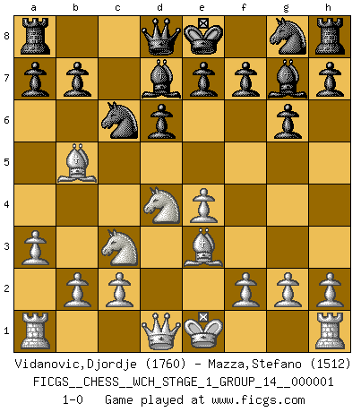 Last move : 1-0 2006 August 14 5:36:31 [Event "FICGS__CHESS__WCH_STAGE_1_GROUP_14__000001"] [Site "FICGS"] [Date "2006.07.01"] [Round "1"] [White "Vidanovic,Djordje"] [Black "Mazza,Stefano"] [Result "1-0"] [WhiteElo "1760"] [BlackElo "1512"] 1.e4 c5 2.Nf3 Nc6 3.a3 d6 4.d4 cxd4 5.Nxd4 g6 6.Bb5 Bd7 7.Nc3 Bg7 8.Be3 1-0 This chess game has been lost on time (started : 2006.07.01 16:18:52) Sicilian defense Player White won this chess game. Follow this game move after move (download)The tactician knows what to do when there is something to do; whereas the strategian knows what to do when there is nothing to do. (Gerald Abrahams) Schach verlangt totale Konzentration. (Robert James Fischer) En un gambito tu regalas un Peón por el bién de tomar un juego perdido. (Samuel Standige Boden) Votre seul travail dans les ouvertures est d'obtenir un milieu de partie jouable. (Lajos Portish) A proverb is a short sentence based on long experience. (Miguel de Cervantes)