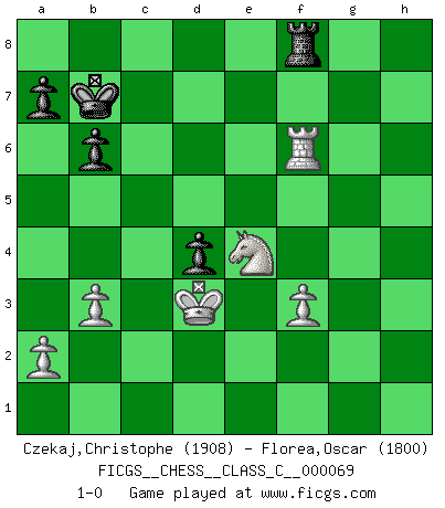 Last move : 1-0 2008 March 26 16:42:53 [Event "FICGS__CHESS__CLASS_C__000069"] [Site "FICGS"] [Date "2007.12.19"] [Round "1"] [White "Czekaj,Christophe"] [Black "Florea,Oscar"] [Result "1-0"] [WhiteElo "1908"] [BlackElo "1800"] 1.e4 c6 2.d4 d5 3.Nc3 dxe4 4.Nxe4 Bf5 5.Ng3 Bg6 6.h4 h6 7.h5 Bh7 8.Nf3 Nd7 9.Bd3 Bxd3 10.Qxd3 Qc7 11.Bd2 e6 12.O-O-O Ngf6 13.Qe2 O-O-O 14.Kb1 Kb8 15.c4 c5 16.Ne5 Nxe5 17.dxe5 Be7 18.exf6 Bxf6 19.Qf3 Qb6 20.Bc3 Bxc3 21.Qxc3 Qc6 22.f3 g5 23.hxg6 fxg6 24.Ne4 g5 25.Qe5+ Ka8 26.Qxc5 Qxc5 27.Nxc5 e5 28.Kc2 b6 29.Ne4 Rc8 30.Rd7 Rxc4+ 31.Kb1 g4 32.b3 Rd4 33.Rxd4 exd4 34.Kc2 gxf3 35.gxf3 Rf8 36.Rh3 Rd8 37.Kd3 Kb7 38.Rxh6 Rf8 39.Rf6 1-0 Caro-Kann : Classical, 6.h4 Queenside Castling by player White (move 12) Queenside Castling by player Black (move 13) Player White won this chess game. Follow this game move after move (download)Help your pieces so they can help you. (Paul Morphy) Je mehr ich von der FIDE weiss, um so weniger verstehe ich. (Alexander Kalifman) Juega la Apertura como un libro, el Juego Medio como un mago y los Finales como una máquina. (Spielmann) Les écrivains ont utilisé les échecs pour analyser les côtés extrêmes de la nature humaine. Dans ce cadre, les échecs offrent un champ d'expérimentation idéal. Mais on pourrait faire la même chose avec la peinture. Et là, en vous référant à Van Gogh, vous ne tirerez pas de conclusion définitive sur les peintres. (Gary Kasparov) Wisdom doesn't necessarily come with age. Sometimes age just shows up all by itself. (Tom Watson)