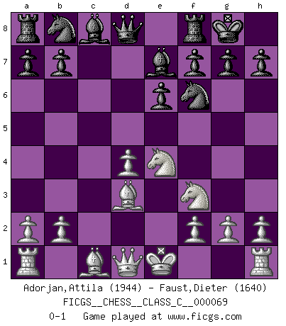 Last move : 0-1 2008 February 2 0:21:20 [Event "FICGS__CHESS__CLASS_C__000069"] [Site "FICGS"] [Date "2007.12.19"] [Round "1"] [White "Adorjan,Attila"] [Black "Faust,Dieter"] [Result "0-1"] [WhiteElo "1944"] [BlackElo "1640"] 1.e4 e6 2.d4 d5 3.Nd2 Be7 4.Bd3 c5 5.c3 cxd4 6.cxd4 dxe4 7.Nxe4 Nf6 8.Nf3 O-O 0-1 This chess game has been lost on time (started : 2007.12.19 14:58:9) French : Tarrasch Kingside Castling by player Black (move 8) Player Black won this chess game. Follow this game move after move (download)The beauty of a move lies not in its' appearance but in the thought behind it. (Siegbert Tarrasch) Um dein Spiel zu verbessern musst du zuallererst das Endspiel studieren, denn diese kann unabhängig studiert werden. Die Eröffnung und das Mittelspiel müssen immer in Bezug gesetzt werden zum Endspiel. (José Raúl Capablanca) El Ajedrez es imaginación. (David Bronstein) Le profane ne songe pas à la somme de jouissance dont il se prive, qui méconnaît ce jeu aux ressources aussi variées que passionnantes. (Jean-Marie Jeanton-Lamarche) Man is reluctant to give credit for intelligence to anyone, except his enemies. (Albert Einstein)