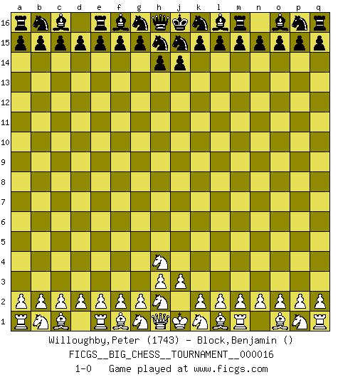 Last move : 1-0 2007 December 23 15:59:14 [Event "FICGS__BIG_CHESS__TOURNAMENT__000016"] [Site "FICGS"] [Date "2007.12.20"] [Round "1"] [White "Willoughby,Peter"] [Black "Block,Benjamin"] [Result "1-0"] [WhiteElo "1743"] [BlackElo ""] 1.j2-h4 1-0 Follow this game move after move (download)Every Pawn is a potential Queen. (James Mason) Die westlichen Werte sind eine Sprache, welche die Putin-Administration nicht versteht. (Garry Kasparov) Sin errores no puede haber brillantez. (Emanuel Lasker) Vouloir jouer aux échecs contre soi-même est aussi paradoxal que vouloir marcher sur son ombre. (Stefan Zweig) Indecision is the key to flexibility. (Unknown)