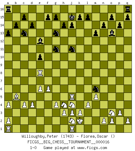 Last move : 1-0 2008 February 7 15:34:48 [Event "FICGS__BIG_CHESS__TOURNAMENT__000016"] [Site "FICGS"] [Date "2007.12.20"] [Round "1"] [White "Willoughby,Peter"] [Black "Florea,Oscar"] [Result "1-0"] [WhiteElo "1743"] [BlackElo ""] 1.j2-h4 b15-b14 2.d2-d4 p15-p14 3.e2-e4 o16-p15 4.e4-e5 c16-b15 5.p1-o3 m15-m13 6.m2-m4 e15-e13 7.k1-l3 l16-o13 8.c2-c3 f16-c13 9.l1-n3 n15-n14 10.p2-p3 k16-l14 11.o1-q3 g16-f14 12.l3-k5 h15-g13 13.m1-m3 j15-k13 14.m4-m5 c13-n3 15.m3-n3 e13-e12 16.l2-l4 e12-e11 17.c1-k8 d15-d14 18.f1-b5 l14-m12 19.g1-j2 h16-l13 20.k2-k3 b16-d15 21.g2-g3 l13-f8 22.k8-e3 d15-c13 23.f2-f3 e11-e10 24.e3-h6 f8-g9 25.g3-g4 e16-e12 26.q3-f13 j16-j15 27.f13-e12 b15-e12 28.h6-j7 g9-b9 29.b1-a3 p16-n15 30.f3-f4 n15-l14 31.f4-f5 l14-j13 32.e5-e6 p15-o16 33.c3-c4 o16-a3 34.b2-a3 b9-a9 35.j1-k2 j13-h11 36.a3-a4 h11-j9 37.h1-j1 m12-l10 38.h2-j4 a9-j1 39.q1-j1 k13-j11 40.e1-e5 j9-g8 41.j7-g9 f14-h13 42.k5-j7 l10-j9 43.n3-n8 g8-j7 44.g9-j7 a15-a13 45.j7-h8 j9-k7 46.h8-q16 m16-q16 47.f5-f6 k7-m6 48.n8-e8 h13-g11 49.e5-j5 1-0 Follow this game move after move (download)You can only get good at Chess if you love the game. (Bobby Fischer) Ich kenne Menschen, die allen Willen der Welt besitzen und doch nicht Schach spielen können. (Robert James Fischer) Morphy probablemente fue el genio más grande de todos. (Bobby Fischer) Comme les marins qui ont mille raisons différentes d'aller en mer, les joueurs d'échecs en ont tout autant avant de s'installer devant une table et jouer... (Vincent Bertignac, philosophe) God, you are such an idiot. - Actually, I thought I was more of a jerk. (Gregory House to Stacy Warner, House M.D.)