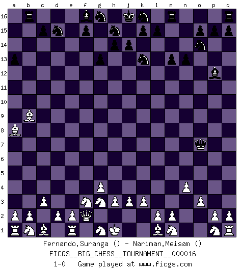 Last move : 1-0 2008 March 23 4:52:23 [Event "FICGS__BIG_CHESS__TOURNAMENT__000016"] [Site "FICGS"] [Date "2007.12.20"] [Round "1"] [White "Fernando,Suranga"] [Black "Nariman,Meisam"] [Result "1-0"] [WhiteElo ""] [BlackElo ""] 1.n2-n4 j15-k13 2.o1-d11 e15-e13 3.g2-g4 d15-d13 4.f1-g2 e13-e12 5.d11-b9 g15-g13 6.g2-a8 a15-a13 7.h1-d5 p16-o14 8.d5-d13 h16-c11 9.c2-c3 c16-e14 10.d13-b15 b16-d15 11.b15-e12 e14-p4 12.e12-l12 p4-m1 13.o2-o3 e16-e11 14.j2-k4 n15-n14 15.k1-l3 m15-m13 16.l12-f7 e11-f11 17.f7-k7 a16-b16 18.l3-m1 f11-f2 19.h2-f3 o16-d6 20.j1-h1 n14-n13 21.k7-k6 c11-c7 22.k4-h5 l16-p12 23.k6-f2 d6-g3 24.h5-g3 c7-o7 25.k2-k3 1-0 This big chess game has been lost on time (started : 2007.12.20 15:3:49) Follow this game move after move (download)Life is like a game of Chess, changing with each move. (Chinese proverb) Ich liebe den Moment, wenn ich das Ego meines Gegenüber breche. (Robert James Fischer) Si el ingenio solamente fuese necesario para lucirse, las mujeres serían las mejores jugadoras de Ajedrez del mundo. (Albin) Même si vous avez un bon coup à faire, regardez toujours s'il n'y en a pas un qui lui soit préférable. (Pedro Damiano) Success without honor is an unseasoned dish; it will satisfy your hunger, but it won't taste good. (Joe Paterno)