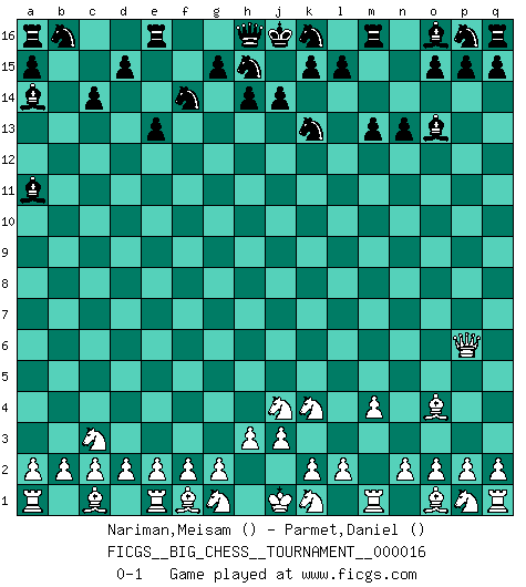 Last move : 0-1 2008 February 14 13:23:56 [Event "FICGS__BIG_CHESS__TOURNAMENT__000016"] [Site "FICGS"] [Date "2007.12.20"] [Round "1"] [White "Nariman,Meisam"] [Black "Parmet,Daniel"] [Result "0-1"] [WhiteElo ""] [BlackElo ""] 1.j2-k4 n15-n13 2.m2-m4 m15-m13 3.h2-j4 l16-o13 4.b1-c3 b15-b13 5.h1-l4 j15-k13 6.l1-o4 e15-e13 7.l4-b13 c16-a14 8.b13-d13 c15-c14 9.d13-f15 g16-f14 10.f15-p6 f16-a11 0-1 This big chess game has been lost on time (started : 2007.12.20 15:3:49) Follow this game move after move (download)If Chess is a science, it's a most inexact one. If Chess is an art, it is too exacting to be seen as one. If Chess is a sport, it's too esoteric. If Chess is a game, it's too demanding to be just a game. If Chess is a mistress, she's a demanding one. If Chess is a passion, it's a rewarding one. If Chess is life, it's a sad one. (Unknown) Versuche, dich von der Sklaverei der Eröffnungsvarianten zu befreien. Stattdessen soll man gewisse Typenpositionen erlernen, die man eingehend analysiert. (Aaron Nimzowitsch) Tu puedes aprender mucho mas de una partida que pierdas que de una partida ganada. Tendras que perder cientos de partidas antes de llegar a ser un buen jugador. (Jose Raul Capablanca) La vie et les Echecs sont tous les deux une lutte constante. (Lasker) Beep ! (R2D2 in Star Wars ep.3)