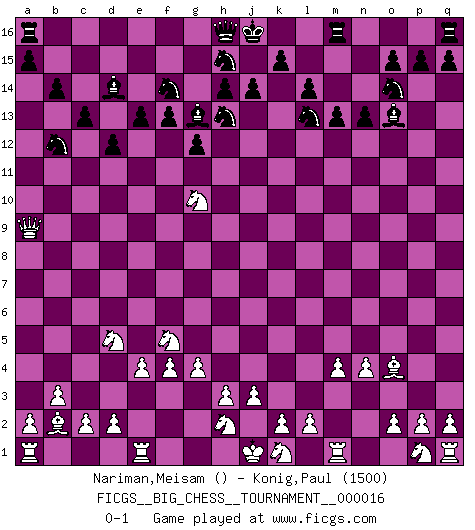 Last move : 0-1 2008 April 5 6:59:9 [Event "FICGS__BIG_CHESS__TOURNAMENT__000016"] [Site "FICGS"] [Date "2007.12.20"] [Round "1"] [White "Nariman,Meisam"] [Black "Konig,Paul"] [Result "0-1"] [WhiteElo ""] [BlackElo "1500"] 1.g2-g4 g15-g13 2.f2-f4 f15-f13 3.e2-e4 e15-e13 4.g1-f3 d15-d13 5.f1-c4 m15-m13 6.b2-b3 c15-c13 7.n2-n4 f16-d14 8.j2-h4 g16-f14 9.c1-b2 p16-o14 10.h1-l4 l15-l14 11.b1-c3 b15-b14 12.f3-e5 c16-b15 13.m2-m4 b16-c14 14.c4-j10 g13-g12 15.l1-o4 n15-n13 16.j10-g8 k16-m15 17.g8-a14 b15-a14 18.l4-a14 e16-b16 19.e5-d7 c14-b12 20.a14-a9 d13-d12 21.o1-l4 o16-e7 22.h4-f5 e7-j11 23.l4-m5 m15-l13 24.m5-a16 b16-a16 25.d7-e9 l16-o13 26.e9-g10 j11-g13 27.c3-d5 j15-h13 0-1 This big chess game has been lost on time (started : 2007.12.20 15:3:49) Follow this game move after move (download)The passion for playing Chess is one of the most unaccountable in the world. (H.G. Wells) Ich verlor meine Bürgerrechte, mein Gehalt wurde mir nicht mehr bezahlt und ich wurde zensiert und durfte nicht mehr ins Ausland reisen. [nach dem Match Fischer-Taimanov 6:0] (Mark Taimanov) Me gusta decir que Bobby Fischer fue el mejor jugador que jamás haya existido. Pero lo que hizo de Fischer un genio, fue su habilidad de mezclar una frescura y pragmatismo Americano con ideas Rusas acerca de la estrategia. (Bruce Pandolfini) Ne tendez aucun piège pour le plaisir ! Ne jouez rien dans l'espoir que l'adversaire réagisse de façon stupide ! Prenez toujours pour acquis que l'adversaire va trouver le meilleur coup ! Ne jouez jamais de coup dans l'espoir que l'adversaire ne voie pas la menace ! Chacun de vos coups doit améliorer la position d'une façon ou d'une autre. There are two kinds of tragedy in this world, one is not getting what you want and the other is getting. (Lord of war)