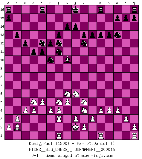 Last move : 0-1 2008 May 5 21:13:32 [Event "FICGS__BIG_CHESS__TOURNAMENT__000016"] [Site "FICGS"] [Date "2007.12.20"] [Round "1"] [White "Konig,Paul"] [Black "Parmet,Daniel"] [Result "0-1"] [WhiteElo "1500"] [BlackElo ""] 1.g2-g4 b15-b14 2.f2-f4 c16-b15 3.p1-o3 e15-e13 4.e2-e4 c15-c13 5.p2-p3 m15-m13 6.d2-d4 l16-o13 7.o1-p2 f15-f13 8.c2-c4 g15-g13 9.b2-b3 d15-d13 10.c1-b2 d13-d12 11.m2-m4 n15-n13 12.b1-c3 e13-e12 13.f1-d3 e12-e11 14.o3-n1 b15-p2 15.n1-p2 f16-d14 16.g1-f3 o16-h10 17.h1-f1 h16-e13 18.l1-o4 h10-o4 19.p2-o4 e13-l7 20.l2-l3 l7-n9 21.n2-n3 l15-l13 22.f1-g1 p16-n15 23.g1-g3 d14-l7 24.h3-h4 h15-j13 25.o4-m5 l7-h10 26.h4-h5 n9-m9 27.j2-k4 j13-g12 28.n3-n4 b16-d15 29.f3-g5 d15-e13 30.e1-e3 e13-d11 31.o2-o4 d11-f10 32.h2-j4 f13-f12 33.j1-j2 g16-f14 34.g5-j6 j15-h13 35.m5-l7 m9-n9 36.l7-k5 n9-g3 37.e3-g3 k16-l14 38.a1-g1 l14-k12 39.e4-e5 h13-g11 40.d3-o13 n15-o13 41.c3-d5 f14-e12 42.k1-h2 b14-b13 43.h2-f3 c13-c12 44.f3-g5 d12-d11 45.j4-h6 k15-k13 0-1 This big chess game has been lost on time (started : 2007.12.20 15:3:49) Follow this game move after move (download)I'm not a materialistic person, in that, I don't suffer the lack or loss of money. The absence of worldly goods I don't look back on. For Chess is a way I can be as materialistic as I want without having to sell my soul. (Jamie Walter Adams) Die meiste Zeit treffe ich auf Gegner, die meine Enkel sein könnten. Ich bin da, um ihnen zu zeigen, dass sie von mir noch einiges lernen können. (Viktor Kortschnoi) Estaba muy claro de que el punto vulnerable del Gran Maestro Americano (Bobby Fischer) radicaba en las posiciones de doble filo, colgantes, irracionales, donde el siempre falló en encontrar un triunfo aún en una posición de clara victoria. (Efim Geller) Ce qui est bien, c'est d'avoir tout un tas de pièces en prise : l'adversaire ne peut en prendre qu'une à la fois. Cité par Thierry Audin. The real danger is not that computers will begin to think like men, but that men will begin to think like computers. (Sydney J. Harris)