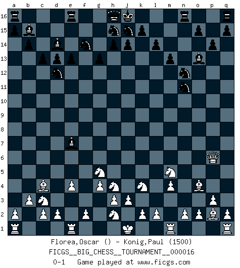 Last move : 0-1 2008 February 7 15:29:58 [Event "FICGS__BIG_CHESS__TOURNAMENT__000016"] [Site "FICGS"] [Date "2007.12.20"] [Round "1"] [White "Florea,Oscar"] [Black "Konig,Paul"] [Result "0-1"] [WhiteElo ""] [BlackElo "1500"] 1.p1-o3 g15-g13 2.g2-g4 f15-f13 3.b2-b3 e15-e13 4.c1-b2 p16-o14 5.p2-p3 d15-d13 6.o1-p2 c15-c13 7.m2-m4 b15-b14 8.l1-o4 b16-c14 9.o3-m2 g16-f14 10.g1-f3 f16-d14 11.j2-k4 c16-b15 12.e2-e4 m15-m13 13.h1-l4 l15-l14 14.k1-l3 l16-p12 15.f1-c4 n15-n13 16.b2-n13 k16-m15 17.l4-f9 m15-n13 18.f9-f13 c14-d12 19.f13-k9 p15-p14 20.l3-m5 p12-o13 21.k9-n6 o16-m14 22.m2-k3 m16-n16 23.b1-c3 n13-p12 24.n6-p6 p12-n11 25.k3-h4 o14-n12 26.f3-g5 m14-e7 0-1 Follow this game move after move (download)Fischer is the strongest player in the world. In fact, the strongest player who ever lived. (Larry Evans) Gegen einen Schachcomputer zu verlieren ist wie Löcher in den Strümpfen zuhaben. Es ist nicht peinlich, solange man der einzige ist der es weiß. (Anonymous) Aquel que teme a un Peón de Reina aislado, debería de retirarse del Ajedrez. (Siegbert Tarrasch) Vouloir jouer aux échecs contre soi-même est aussi paradoxal que vouloir marcher sur son ombre. (Stefan Zweig) Now you put water in a cup, it becomes the cup; You put water into a bottle it becomes the bottle; You put it in a teapot it becomes the teapot. Water can flow or it can crash. Be water, my friend. (Bruce Lee)