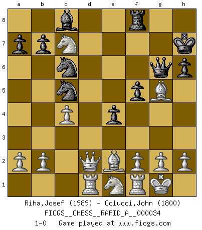 Last move : 1-0 2008 January 4 20:32:56 [Event "FICGS__CHESS__RAPID_A__000034"] [Site "FICGS"] [Date "2007.12.21"] [Round "1"] [White "Riha,Josef"] [Black "Colucci,John"] [Result "1-0"] [WhiteElo "1989"] [BlackElo "1800"] 1.d4 g6 2.e4 Bg7 3.c4 d6 4.Nc3 Nd7 5.Nf3 e5 6.Be2 Ne7 7.O-O O-O 8.Be3 h6 9.Qd2 Kh7 10.Rad1 f5 11.dxe5 dxe5 12.exf5 gxf5 13.Bg5 Qe8 14.Nb5 Nc6 15.Nxc7 Qg6 16.Nxa8 e4 17.Bf4 Bf6 18.Ne1 Nc5 19.Nc7 Bg5 20.Bxg5 1-0 Modern defense Kingside Castling by player White (move 7) Kingside Castling by player Black (move 7) Player White won this chess game. Follow this game move after move (download)I won't play with you anymore. You have insulted my friend. - When an opponent cursed himself for a blunder. (Miguel Najdorf) Warum muß ich gegen diesen IDIOTEN verlieren? (Aaron Nimzowitsch) Yo no creo en la psicología. Yo creo en las buenas movidas. (Bobby Fischer) Vous m'avez demandé de vous exposer quel est le fondement de la prière. Je ne fais que préparer les pièces du jeu sur la table... Nous sera-t-il permis d'en adopter les règles et si nous les appliquons scrupuleusement nous ne tarderons pas à faire mat le Roi divin ! Il ne pourra échapper à nos mains. (Sainte Thérèse d'Avila, Chemin de perfection) 98% of all statistics are made up. (Author unknown)
