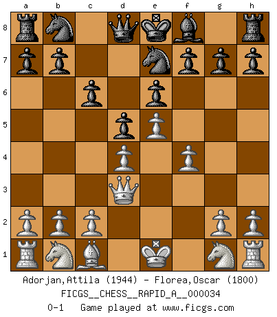 Last move : 0-1 2008 January 31 0:18:17 [Event "FICGS__CHESS__RAPID_A__000034"] [Site "FICGS"] [Date "2007.12.21"] [Round "1"] [White "Adorjan,Attila"] [Black "Florea,Oscar"] [Result "0-1"] [WhiteElo "1944"] [BlackElo "1800"] 1.e4 c6 2.d4 d5 3.e5 Bf5 4.Bd3 Bxd3 5.Qxd3 e6 6.f4 Ne7 0-1 This chess game has been lost on time (started : 2007.12.21 15:46:10) Caro-Kann : Advance variation Player Black won this chess game. Follow this game move after move (download)For me, Chess is life and every game is like a new life. Every Chess player gets to live many lives in one lifetime. (Eduard Gufeld) Wer mein Gambit spielt, muß bereit sein, alle Brücken hinter sich abzubrechen. Es verändert den ganzen Menschen. Es wirkt wie ein Zauberstab und fördert verkümmerte, gute Charakter- eigenschaften wieder zu Tage. (Emil Joseph Diemer) Realmente no sabemos como el juego fue inventado, aunque hay sospechas. Tan pronto como descubramos a los culpables, se los haremos saber. (Bruce Pandolfini) Des points faibles ou des trous dans la position de l'adversaire doivent être occupés par des pièces et non pas par des pions. (Siegbert Tarrasch) Chess is everything: art, science and sport. (Anatoly Karpov)