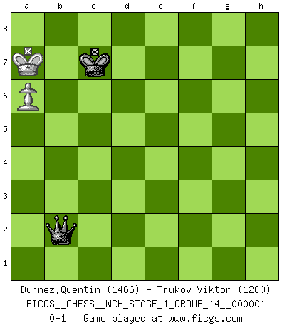Last move : 0-1 2006 November 10 21:59:49 [Event "FICGS__CHESS__WCH_STAGE_1_GROUP_14__000001"] [Site "FICGS"] [Date "2006.07.01"] [Round "1"] [White "Durnez,Quentin"] [Black "Trukov,Viktor"] [Result "0-1"] [WhiteElo "1466"] [BlackElo "1200"] 1.e4 e5 2.Nf3 d5 3.exd5 e4 4.Qe2 Nf6 5.d3 Qxd5 6.Nc3 Bb4 7.Bd2 Bxc3 8.Bxc3 Bg4 9.Bxf6 gxf6 10.O-O-O Nd7 11.Qxe4 Qxe4 12.dxe4 O-O-O 13.Bc4 Ne5 14.Rxd8 Rxd8 15.Nxe5 fxe5 16.Bxf7 Rf8 17.f3 Rxf7 18.fxg4 Rf4 19.h3 Rxe4 20.g5 Re2 21.Rg1 e4 22.h4 Rf2 23.g4 e3 24.Kd1 Rd2 25.Ke1 Rxc2 26.Rf1 Kd8 27.h5 Rxb2 28.g6 hxg6 29.hxg6 Rb1+ 30.Ke2 Rxf1 31.Kxf1 Ke7 32.g5 Kf8 33.Ke2 b5 34.Kxe3 c5 35.Ke4 a5 36.Kd5 c4 37.Kd4 a4 38.a3 Kg7 39.Kc3 Kxg6 40.Kb4 Kxg5 41.Kxb5 c3 42.Kxa4 c2 43.Kb5 c1Q 44.a4 Qb2 45.Ka6 Kf6 46.a5 Ke7 47.Ka7 Kd7 48.a6 Kc7 0-1 QP counter-gambit (elephant gambit) Queenside Castling by player White (move 10) Queenside Castling by player Black (move 12) 10 pieces endgame at move 30 : White KPPP , Black KRPPPP WHITE : King + 3 Pawns BLACK : King + 1 Rook 4 Pawns 9 pieces endgame at move 31 : White KPPP , Black KPPPP WHITE : King + 3 Pawns BLACK : King + 4 Pawns 8 pieces endgame at move 34 : White KPPP , Black KPPP WHITE : King + 3 Pawns BLACK : King + 3 Pawns 7 pieces endgame at move 39 : White KPP , Black KPPP WHITE : King + 2 Pawns BLACK : King + 3 Pawns 6 pieces endgame at move 40 : White KP , Black KPPP WHITE : King + 1 Pawn BLACK : King + 3 Pawns 5 pieces endgame at move 41 : White KP , Black KPP WHITE : King + 1 Pawn BLACK : King + 2 Pawns 4 pieces endgame at move 42 : White KP , Black KP WHITE : King + 1 Pawn BLACK : King + 1 Pawn Promotion Queen by player Black (move 43) Player Black won this chess game. Follow this game move after move (download)There is no remorse like the remorse of Chess. (H. G. Wells) Das Schachspiel ist ein See, in welchem eine Mücke baden und ein Elefant ertrinken kann. (Emanuel Lasker) Solo los afeminados hacen el Enroque. (Rob Sillars) Le pion, dans sa simplicité, marche droit devant lui, mais lorsqu'il prend, il le fait obliquement? Ainsi l'homme, tant qu'il reste pauvre, marche dans la droiture et vit honnêtement, mais lorsqu'il recherche les honneurs, il flatte, se parjure et, par les voies obliques, cherche une position supérieure sur l'échiquier du monde. (Jean de Galles) Good decisions come from experience, and experience comes from bad decisions. (Anonymous)